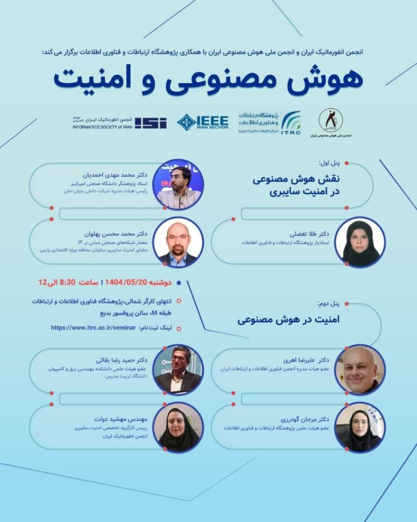 پنل هوش مصنوعی و امنیت توسط انجمن انفورماتیک ایران و انجمن ملی هوش مصنوعی ایران با همکاری پژوهشگاه ارتباطات و فناوری اطلاعات در تاریخ ۲۰ مرداد در پژوهشگاه فناوری اطلاعات و ارتباطات برگزار شد.