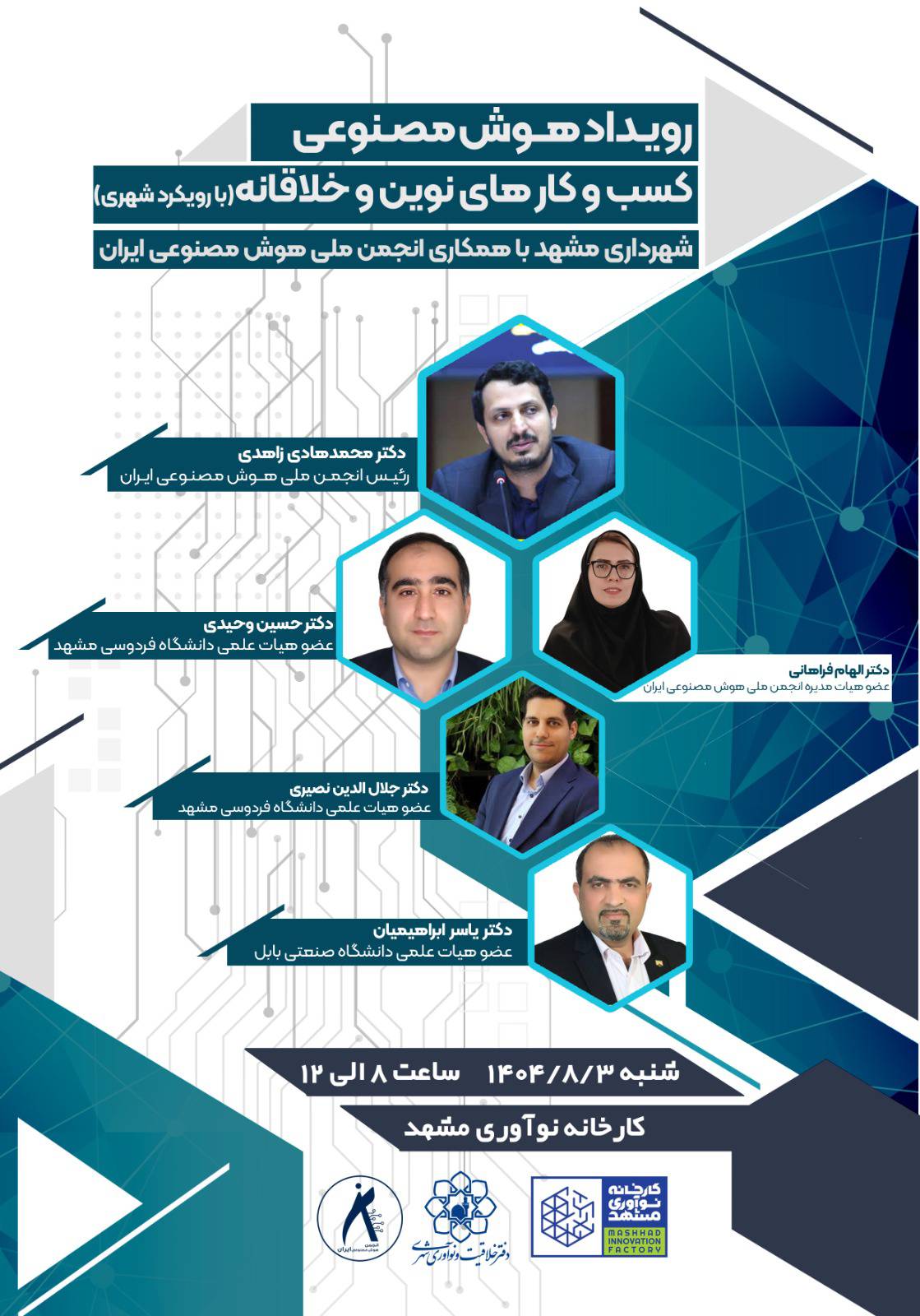 رویداد بزرگ هوش مصنوعی کسب و کارهای نوین و خلاقانه شهری مکان محور توسط شهرداری مشهد و با حمایت علمی و همکاری کمیته علم داده مکانی و هوش مصنوعی جغرافیایی انجمن ملی هوش مصنوعی ایران در تاریخ 3 آبان ماه 1404 در محل کارخانه نوآوری مشهد برگزار شد.