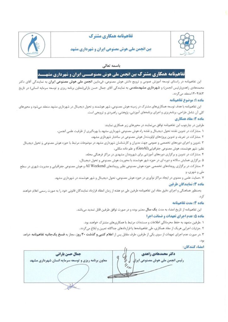 در حاشیه این رویداد تفاهم نامه ای در حضور استاندار محترم استان خراسان رضوی جناب آقای دکتر مظفری بین آقای دکتر محمد هادی زاهدی، رئیس انجمن ملی هوش مصنوعی ایران و حسن جمال بارانی، معاون برنامه ریزی و توسعه سرمایه انسانی شهرداری مشهد، منعقد شد. هدف از این تفاهم نامه، همکاری در حوزه آموزش، فرهنگ سازی و پیاده سازی هوش مصنوعی با محوریت حوزه های شهری و مکانی و همچنین تشریک مساعی در جهت برگزاری رویداد های مشابه در سطح مجمع کلان شهر های کشور با محوریت شهرداری مشهد می باشد.